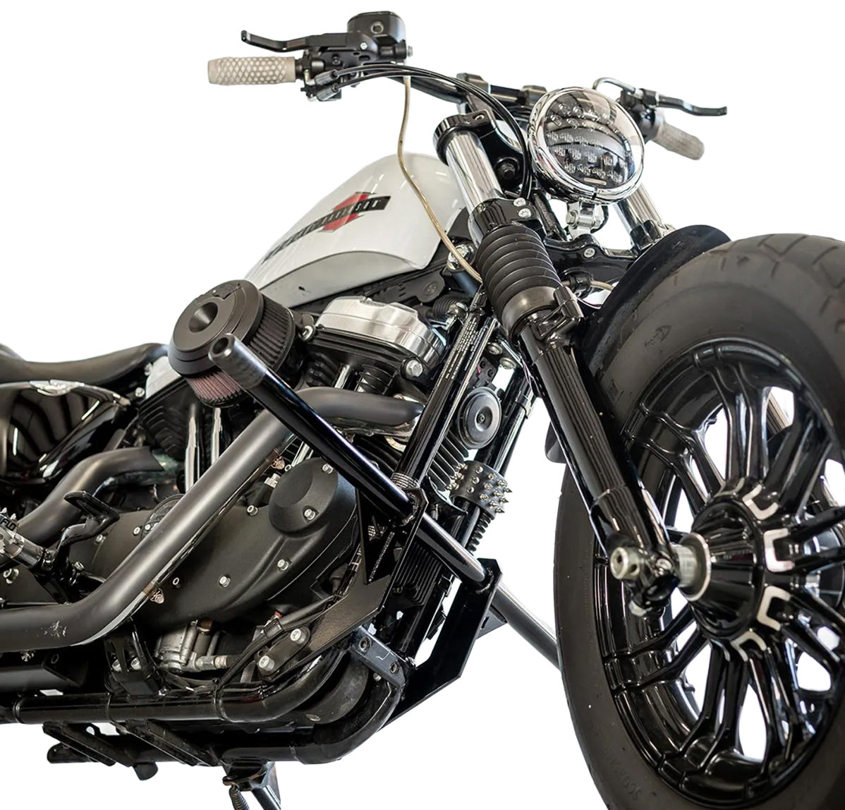 Front Crash Bar for 2004-2023 Harley Davidson Sportster Motorcycles. Fox Fab designed, fabricated, tested and refined these crash bars in-house right at Fox Fab's shop in Denver, Colorado. A lot of research and development went into getting the positioning and sizing perfect. Designed to fit close to the frame for a sleek look. Crash bar is designed to be taller than the foot pegs while mounted to the bike, for a wider turning angle.