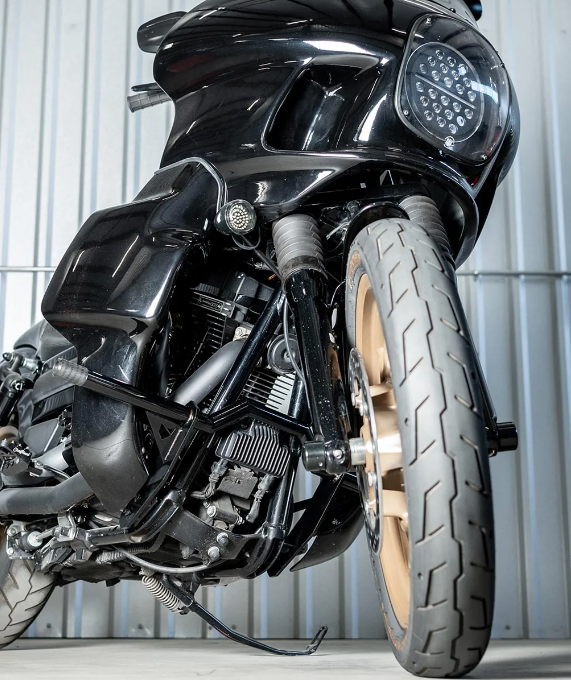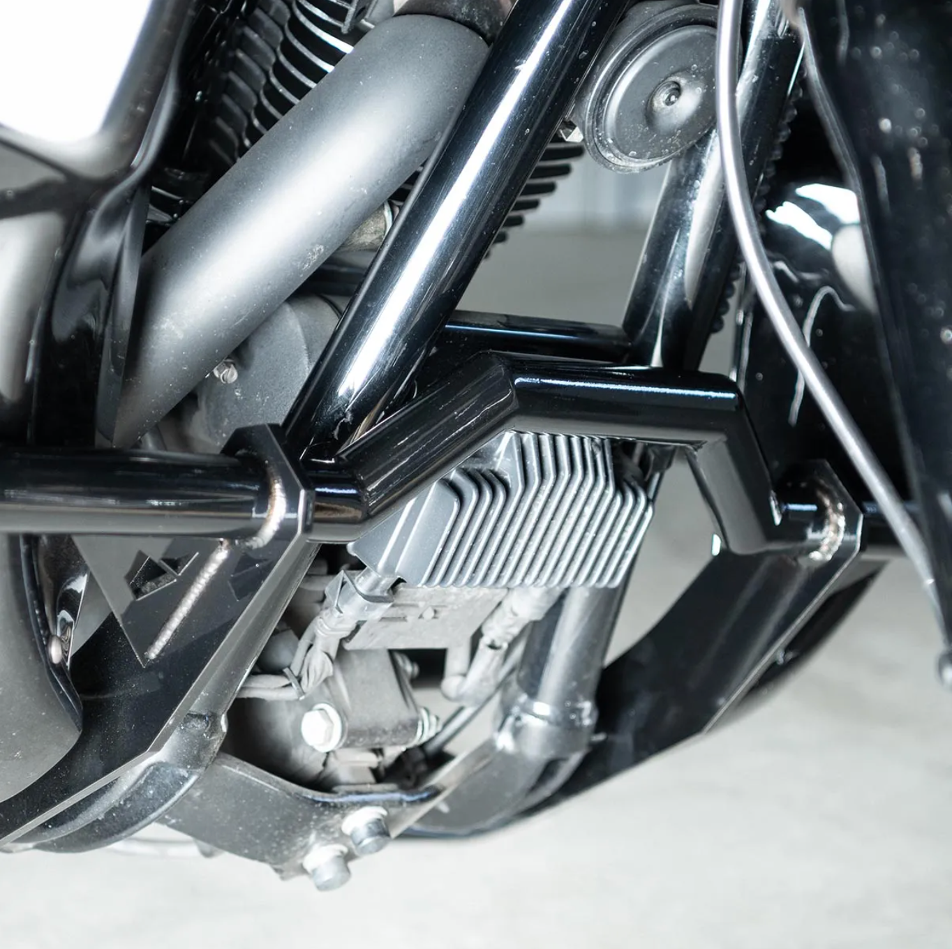 Dyna Crashbar for 2006-2017 models.This is the main difference from the version for previous models is that the tubing on the crash bar is moved to work with the voltage regulator on the bike. Whether you’re a stunt rider or just an everyday rider, if you slide out or tip over, these crashbars protect that new paint job. They can also be used as highway pegs if you want to rest your feet on them.32 inches wide to match most standard handlebar widths. Available in black only. Ships with two, two-inch Delrin sliders.