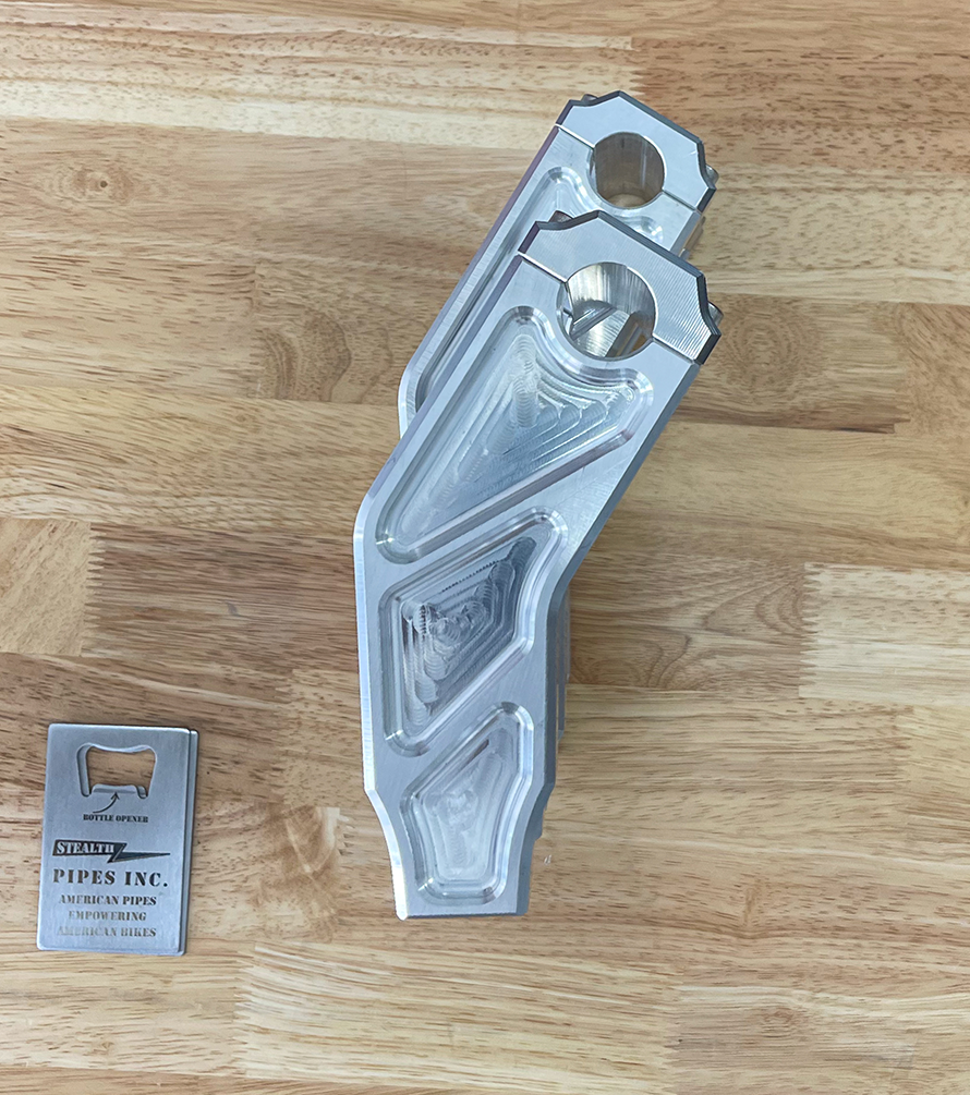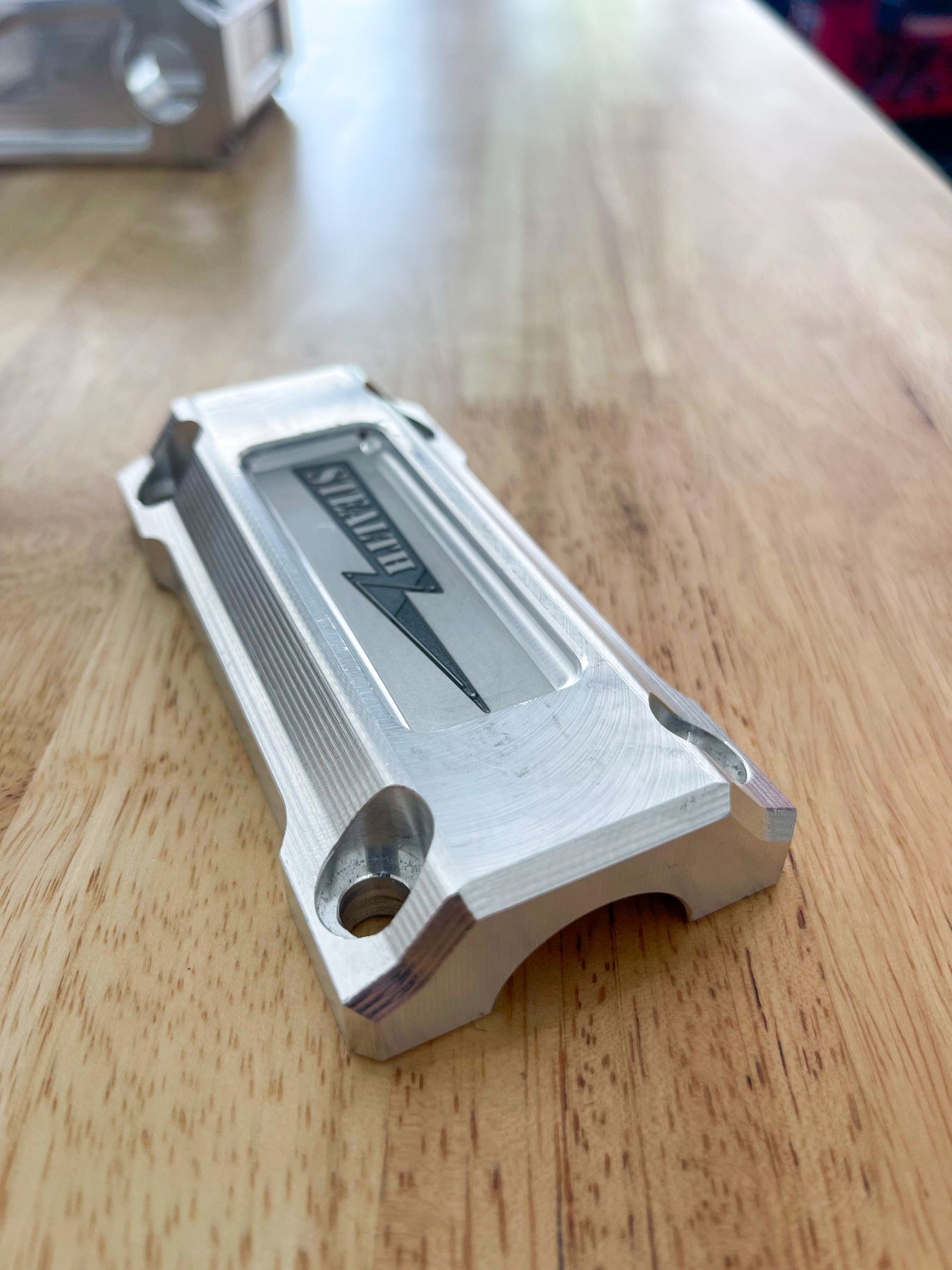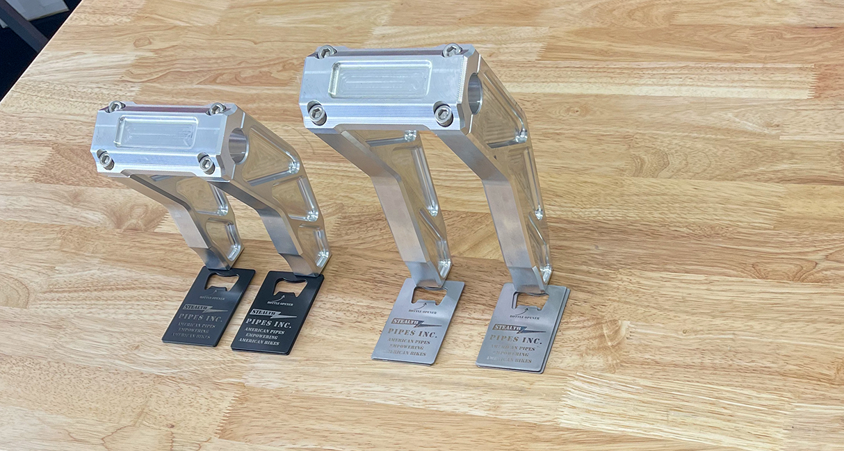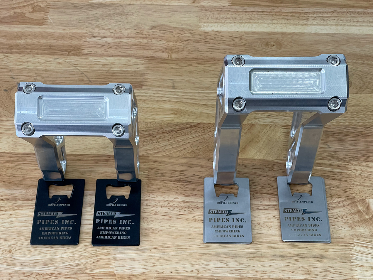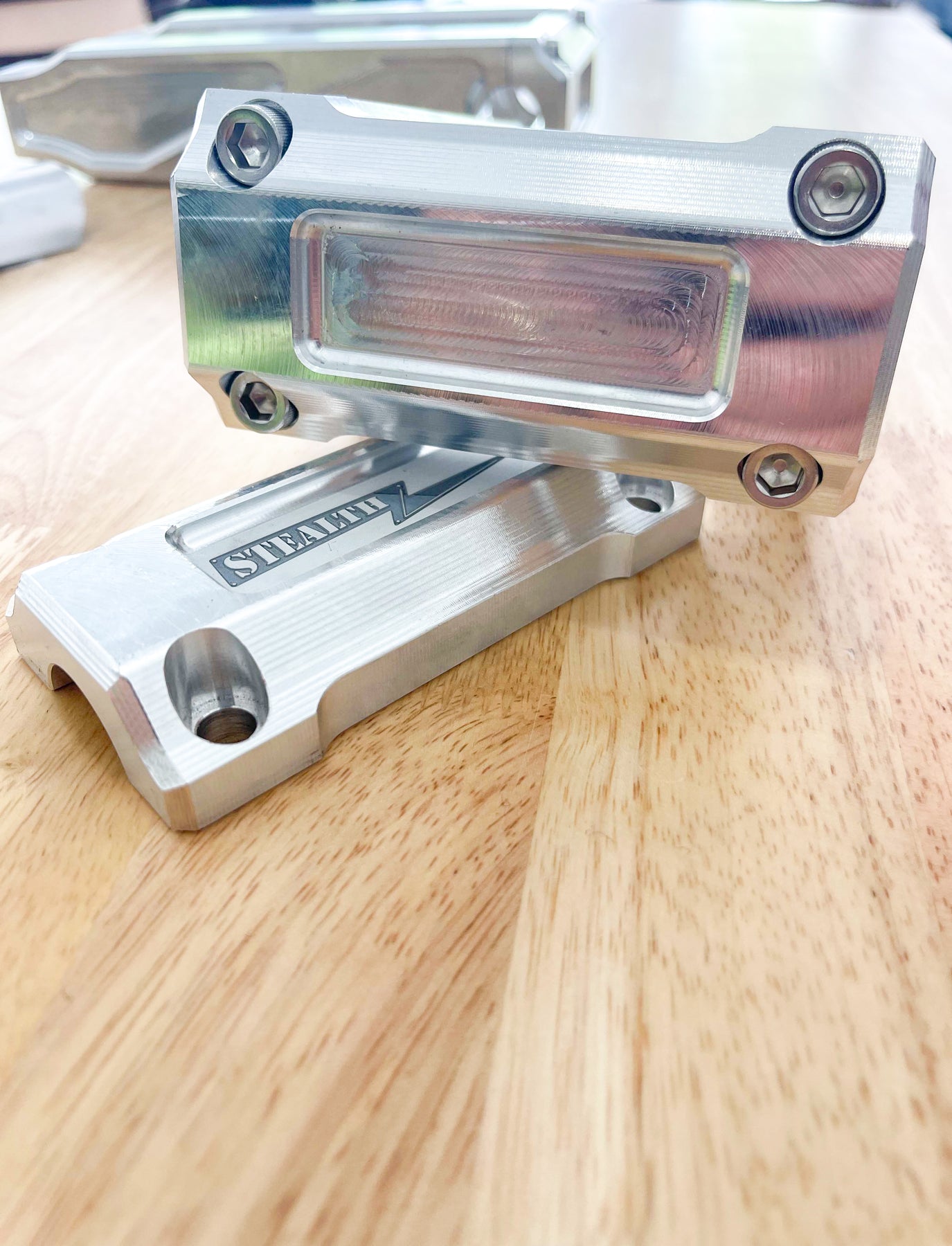 The Stealth Pipes Bar Risers are CNC machined in the USA to give your handlebars the perfect height and stance. Built from aircraft grade aluminum with a 1” clamp, these risers are available in multiple configurations to fit your riding style. The top clamp can also be custom laser engraved with your design for a personalized touch.