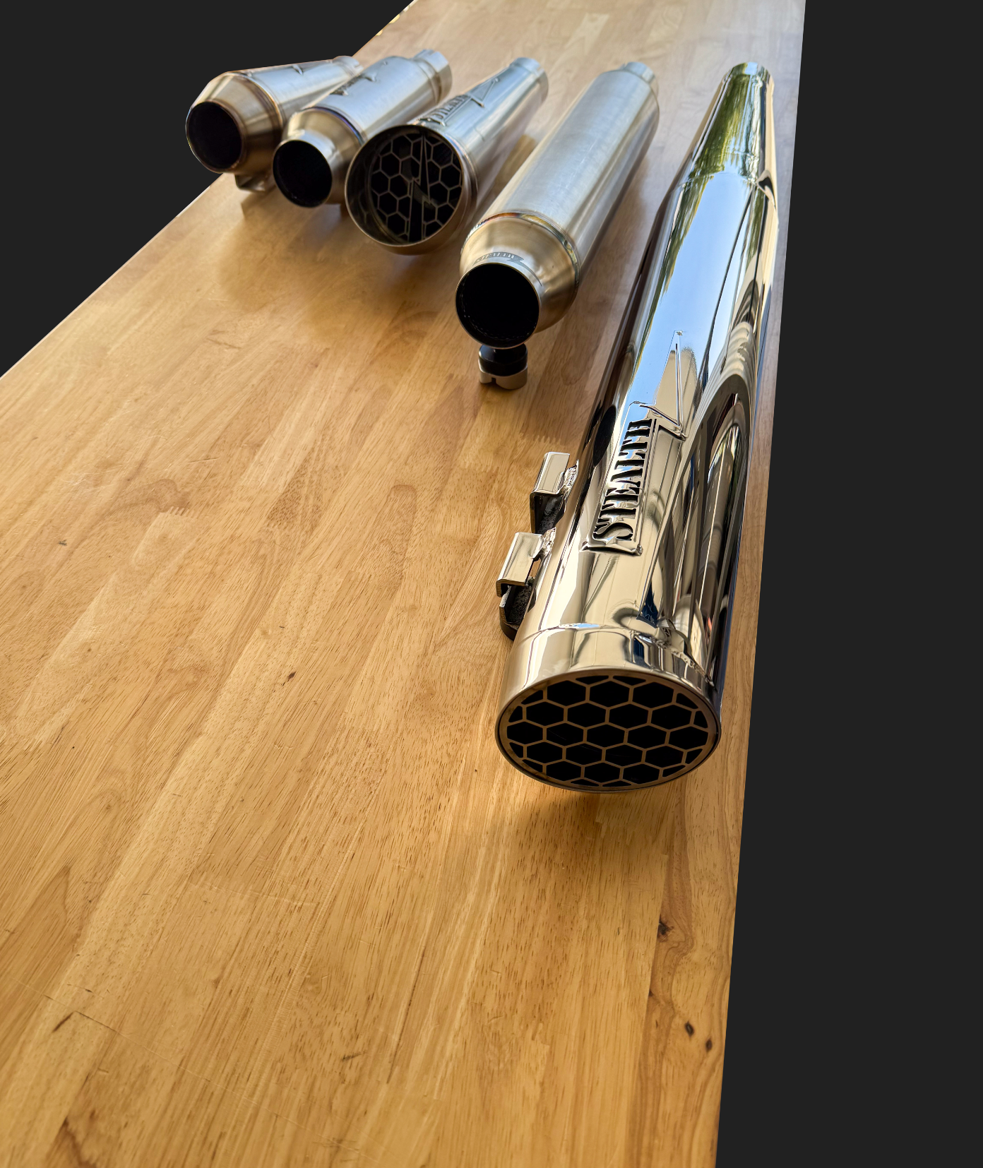 The Stealth Pipes Full Length Bagger Slip On Muffler was built for riders who wanted more length, more tone, and more presence on their touring setup. Designed to mount directly under your OEM bags using the stock rubber grommets and plate, this modular muffler brings a deep, commanding sound to your Harley no matter the stage of your build.