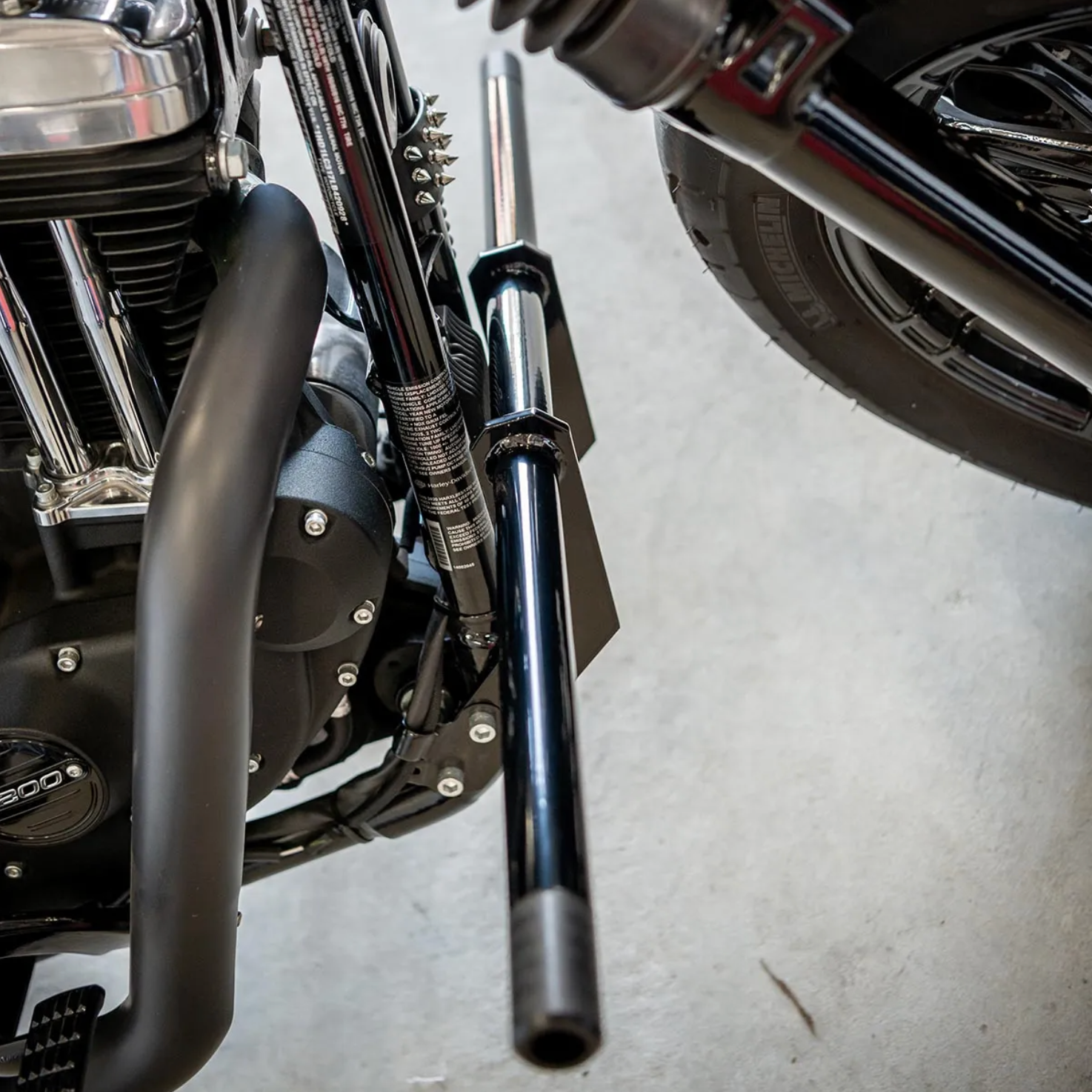 Front Crash Bar for 2004-2023 Harley Davidson Sportster Motorcycles. Fox Fab designed, fabricated, tested and refined these crash bars in-house right at Fox Fab's shop in Denver, Colorado. A lot of research and development went into getting the positioning and sizing perfect. Designed to fit close to the frame for a sleek look. Crash bar is designed to be taller than the foot pegs while mounted to the bike, for a wider turning angle.