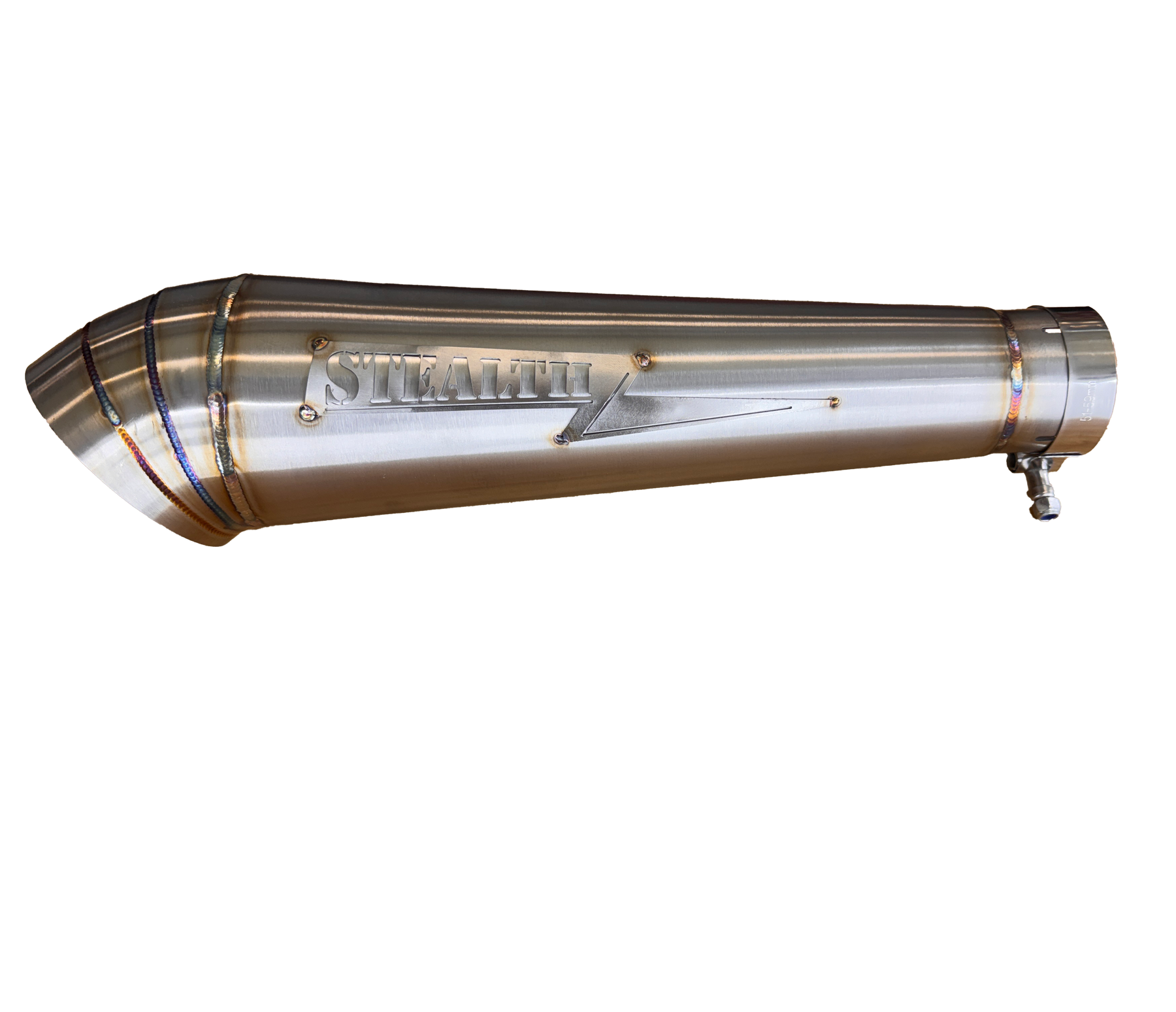 The Stealth Cone-Style Turndown Muffler, also known as the Streetsweeper, takes our classic reverse cone design and aims it straight at the pavement for a loud, aggressive exhaust tone. Hand TIG welded in the USA, each muffler showcases colorful welds and the raw craftsmanship Stealth is known for.